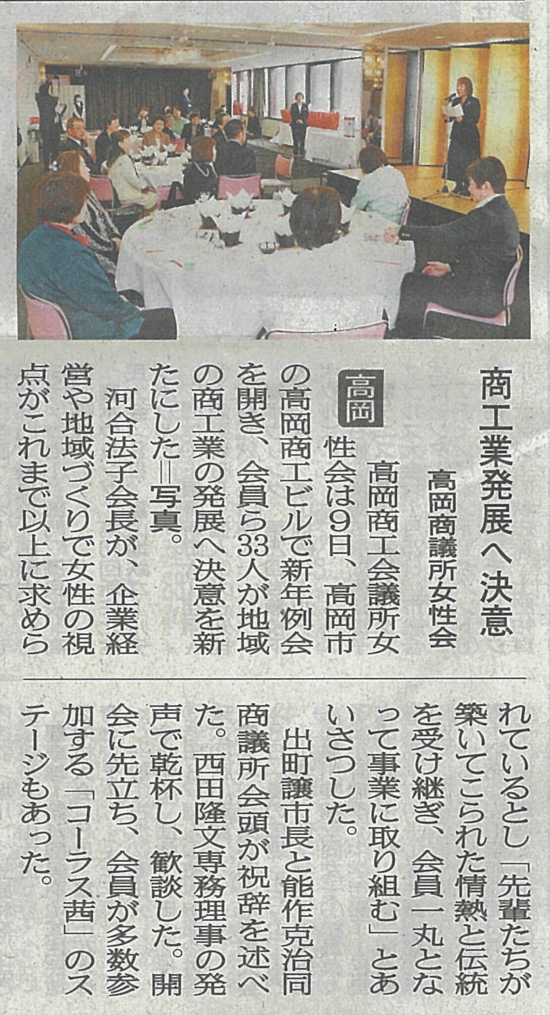高岡商工会議所女性会[外部サイト](河合法子会長、兼弊社専務取締役)は2月9日(月)、高岡商工ビルで新年例会を開き、会員ら33名が地域の商工業の発展へ決意を新たにしました。北日本新聞に掲載されましたので、是非ご覧ください。